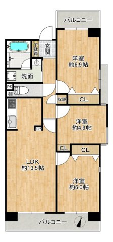 【居間・リビング】◆広々LDKは約13.5帖!キッチンは空間を有効活用できる壁付けタイプです! ◆木目の床・建具×白いクロスとベーシックな内装につき、様々な家具との相性はバッチリです!