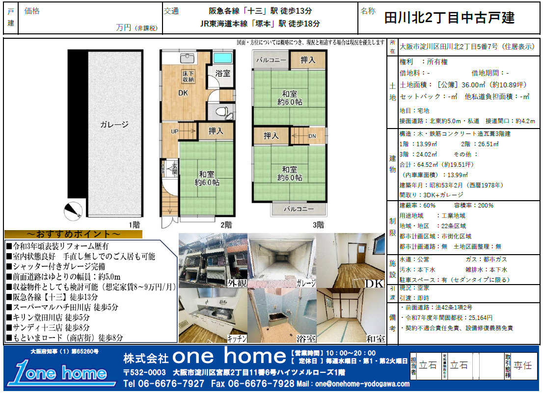 令和3年室内表装リフォーム済・3DK+ガレージ付き!! 阪急各線「十三」駅徒歩13分の立地♪