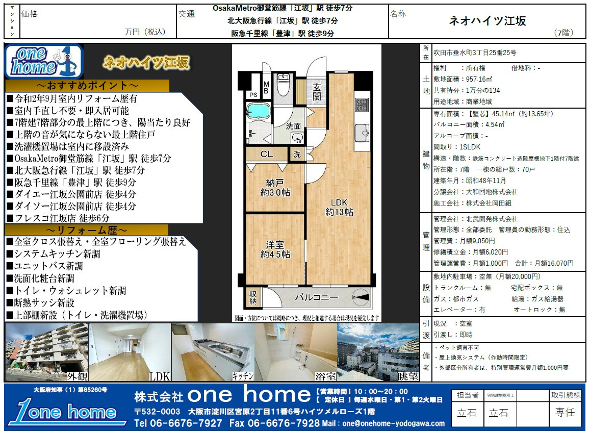 昭和48年築・専有面積:45.14㎡・1SLDK!! OsakaMetro御堂筋線「江坂」駅徒歩7分、吹田市垂水町3丁目に位置するマンション♪