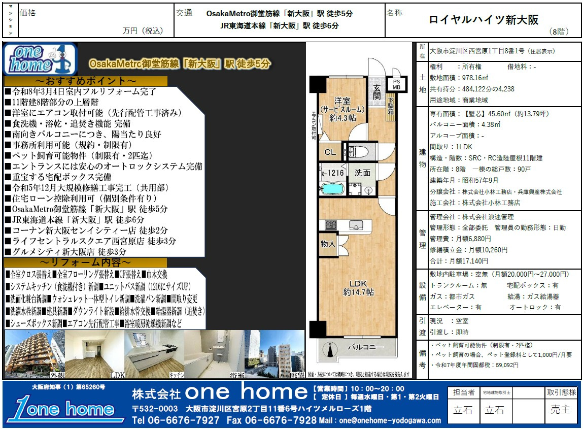 弊社売主物件。昭和57年築・専有面積:45.60㎡・1LDKタイプ!! OsakaMetro御堂筋線「新大阪」駅徒歩5分、淀川区西宮原1丁目に位置するマンション♪